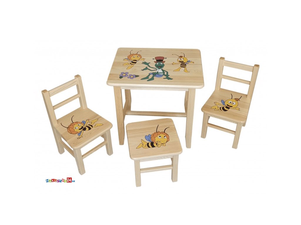 Přizpůsobením nabídky přáním a zájmům nejmenších zákazníků jsme připravili varianty stolků a židliček pomalovaných motivy z oblíbených pohádek. Pohádkové motivy jsou tištěny moderní metodou UV tisku – trvanlivé, odolné proti poškrábání a trvale omyvatelné obrázky. Proporce sady jsou navrženy tak, aby byly vhodné pro děti ve věku od 1 do 4 let, v závislosti na výšce dítěte. Sada se dodává kompletní, není nutné ji šroubovat. Celá sada je chráněna ekologickým lakem na dřevo.