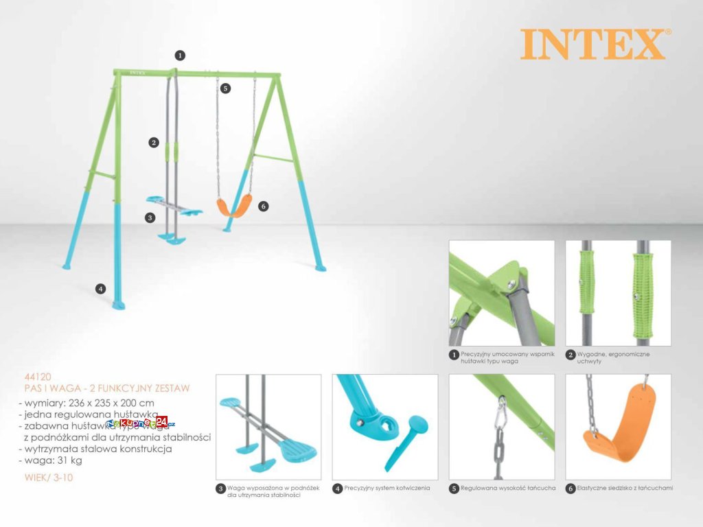 Proměňte svou zahradu v bezpečné a zábavné hřiště! Dvojitá zahradní houpačka INTEX 44120 spojuje klasickou houpačku s flexibilním sedátkem a glider houpačku s opěrkami nohou. Tato kombinace přináší rozmanitou zábavu pro až tři děti najednou. Díky atraktivnímu barevnému provedení a promyšlené ergonomii se stane oblíbeným místem pro hru i relax.
