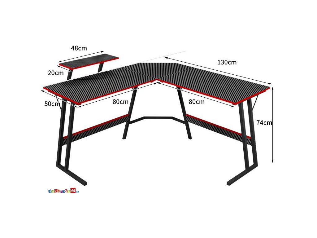 Pracovní deska o tloušťce 15 mm s povrchem z carbonu je odolná proti poškrábání a intenzivnímu používání, zatímco ocelová konstrukce zajišťuje stabilitu a dlouhou životnost. Přídavná police na monitor (48 × 20 cm) zvedá obrazovku do ergonomické výšky, uvolňuje místo na pracovní ploše a zvyšuje pohodlí při práci i hraní.